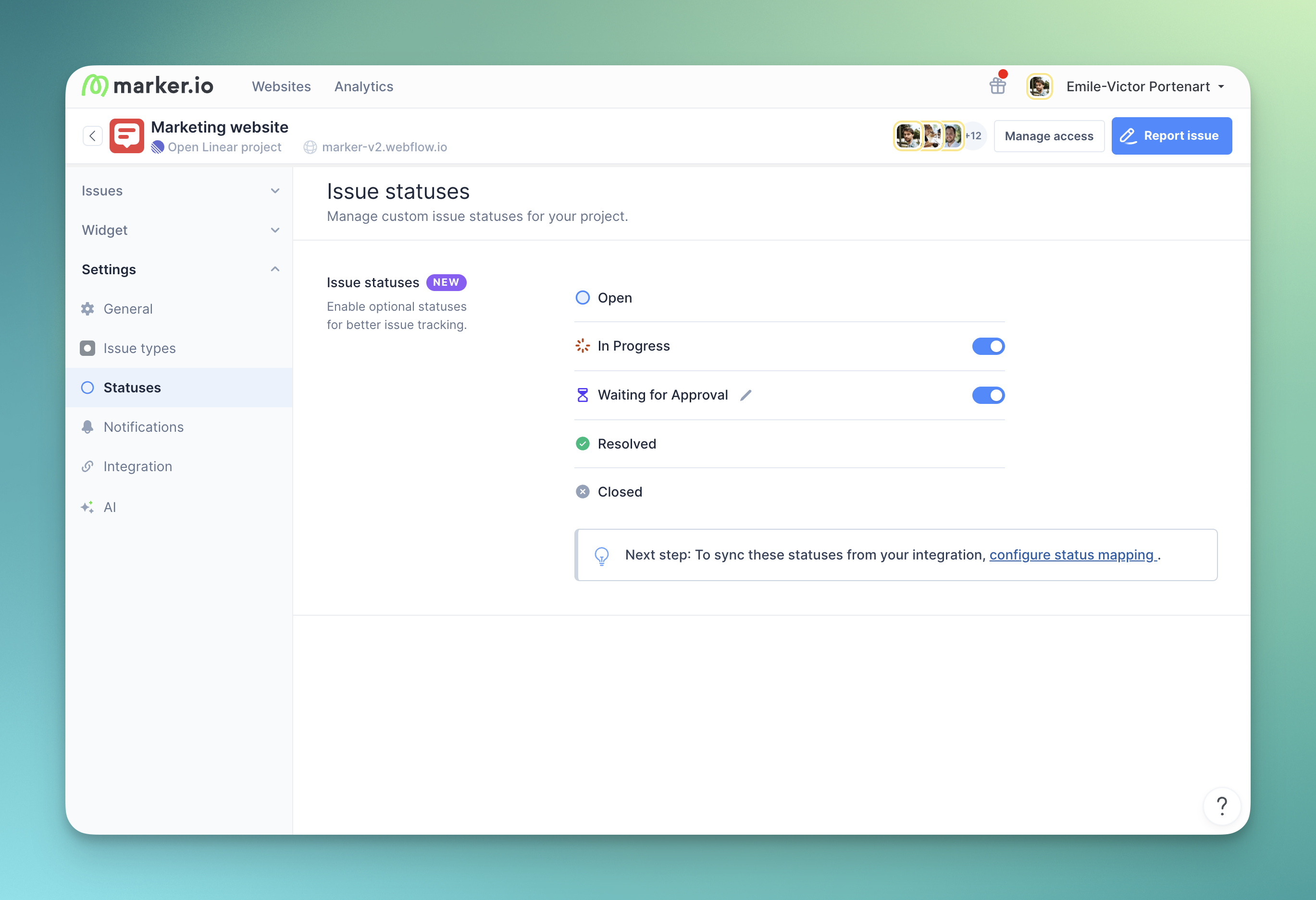 - Integration mapping: Map each status to corresponding statuses in Jira, Linear, ClickUp, and other integrations. When creating a new project, Marker.io automatically matches In Progress to the integration's equivalent status.
