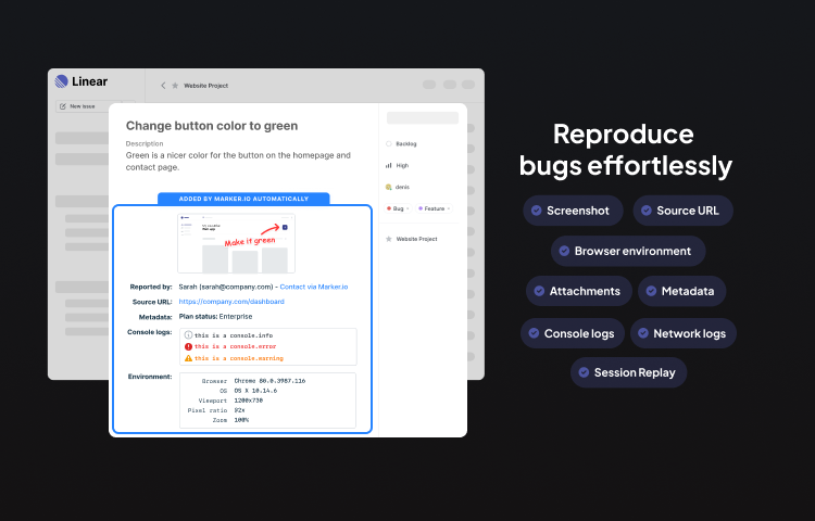 As soon as an issue is marked as “Done” in Linear, it's “Resolved” in Marker.io. You can even set it up so the client or user is automatically notified.