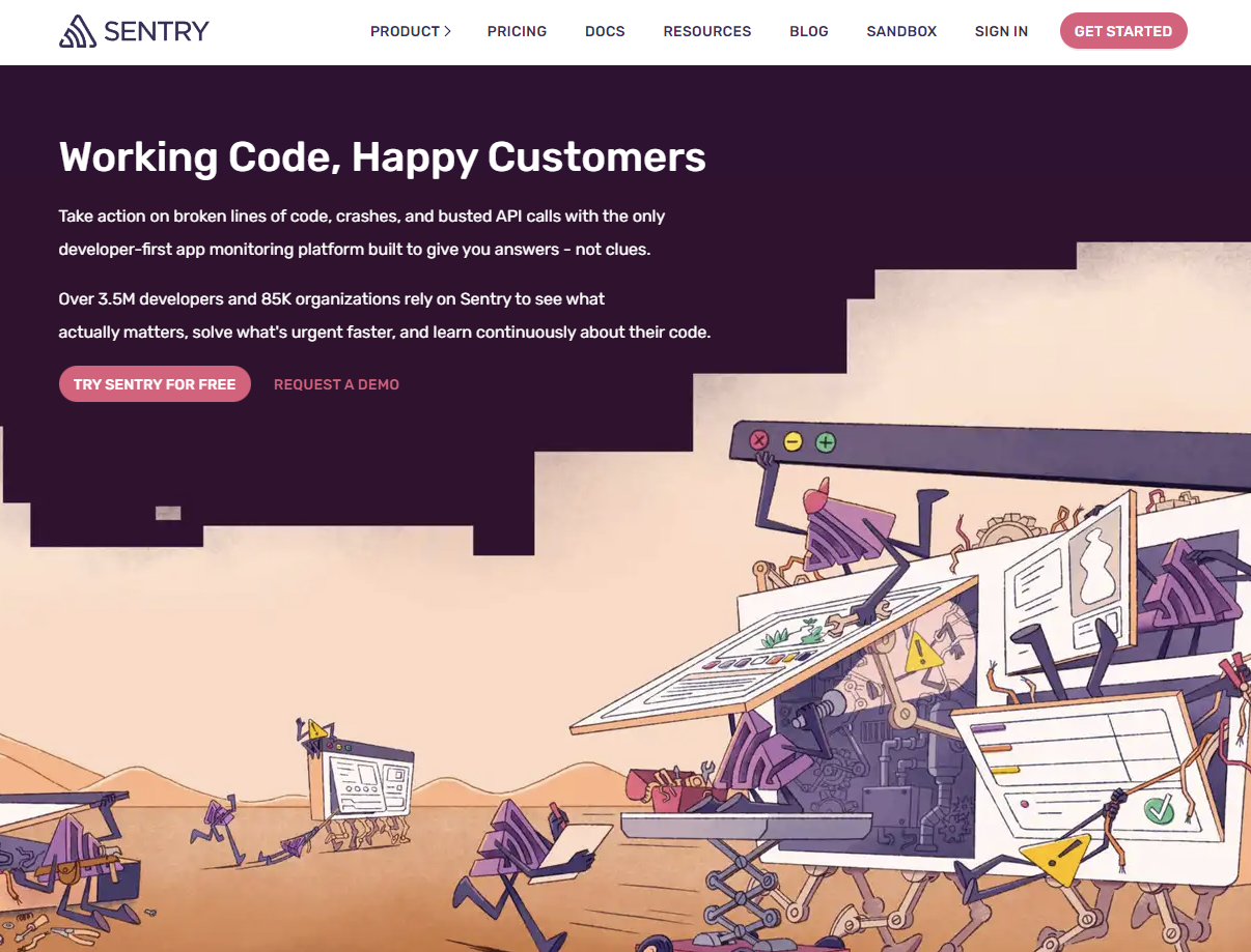 Over 3.5 million developers and 85,000 organizations trust Sentry to monitor API, web, and app development bugs.