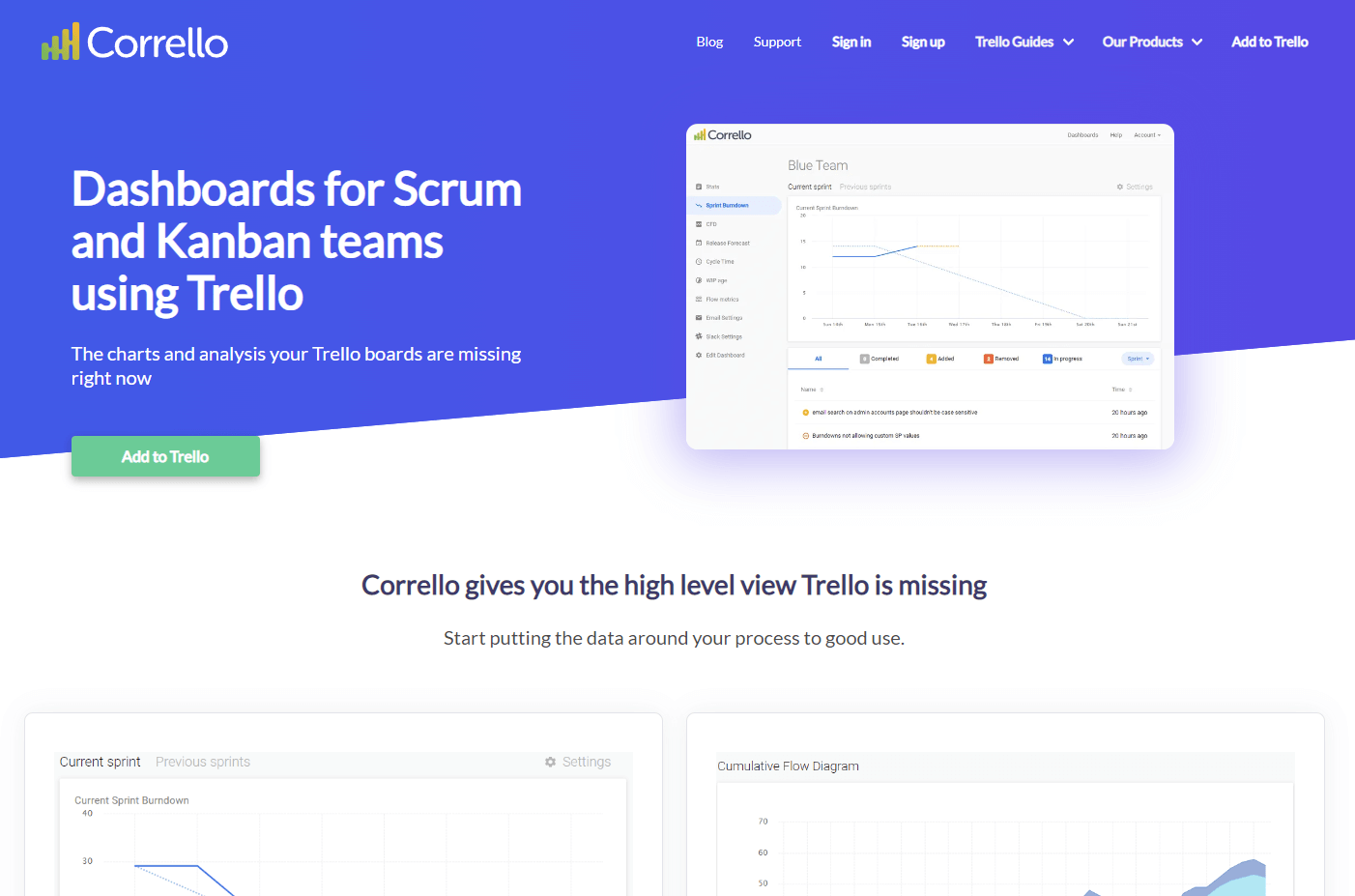 Corrello allows you to add agile project dashboards to your Trello boards. You’ll get access to important data like burndown charts, cumulative flow diagrams, cycle time charts, and more—in real-time.