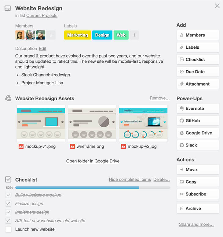 For example, dragging and dropping cards within lists helps prioritize tasks. And moving them across lists offers the simplest visual cue to track progress.