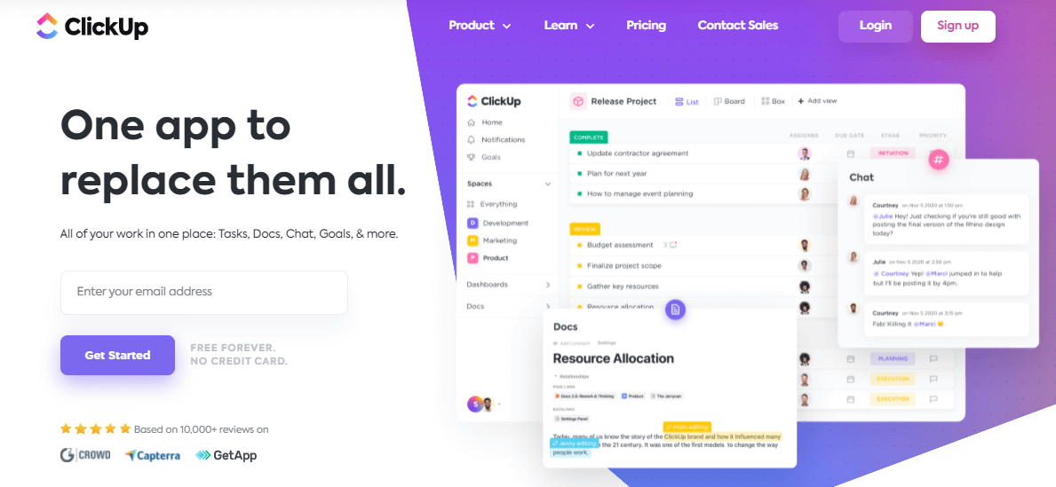 ClickUp facilitates task assignment to team members and streamlines communication between partners. With this tool, you can: