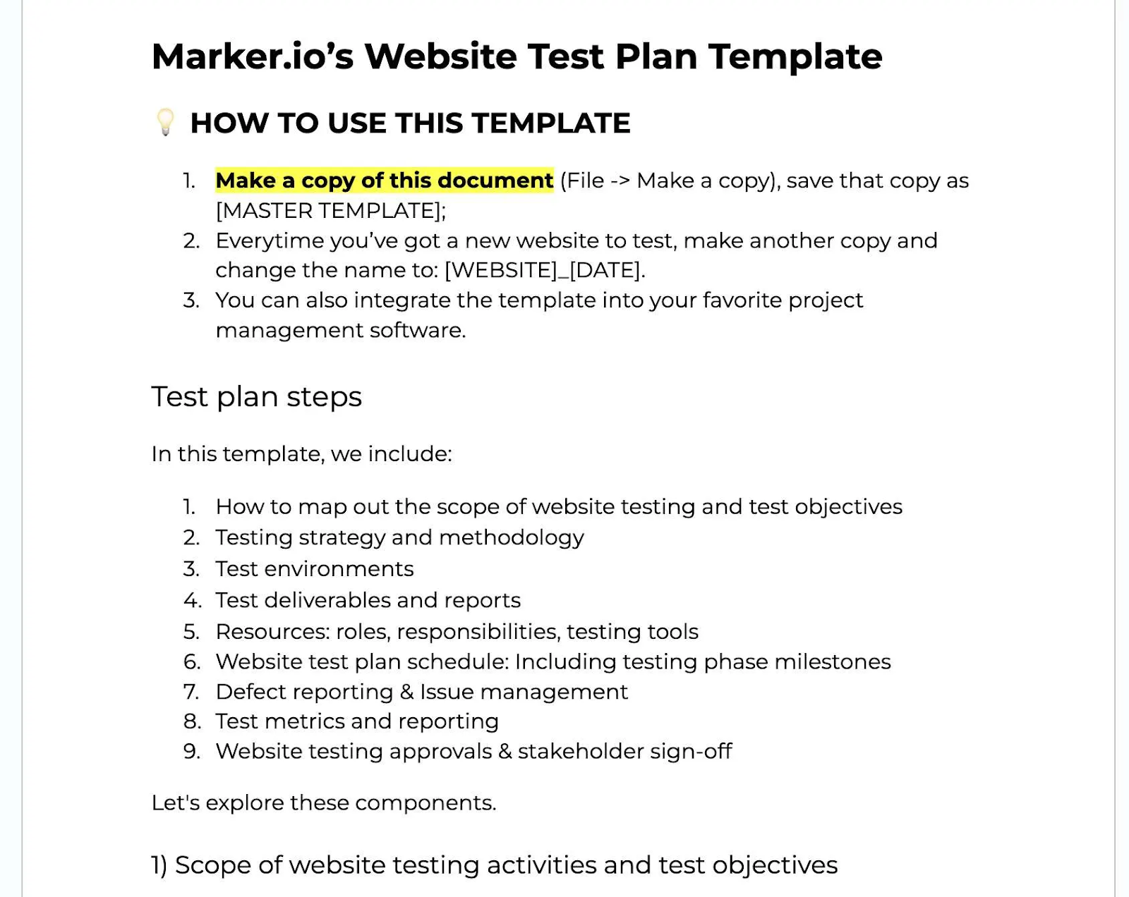 A test plan or checklist outlines the full scope of what needs to be tested. It serves as the roadmap for testing to ensure that all aspects of the website, from functionality, to navigation and user experience, are covered.